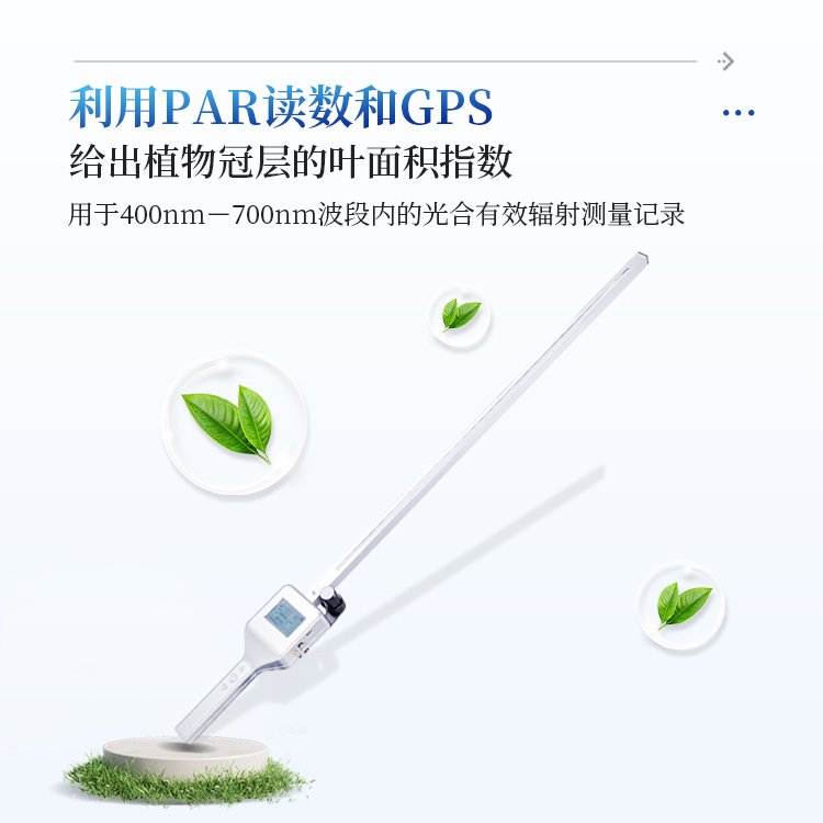 手持冠层分析仪可广泛应用于农业生产和农业科研,为进行冠层光能资源调查,测量植物冠层中光线的拦截,研究作物的生长发育、产量品质与光能利用间的关系,本仪器用于400nm——700nm波段内的光合有效辐射(PAR)测量、记录,测量值的单位是平方米·秒上的微摩尔(μmol/㎡s)。同时使用PAR读数和GPS定位信息等参数可给出植物冠层的叶面积指数(LAI)。